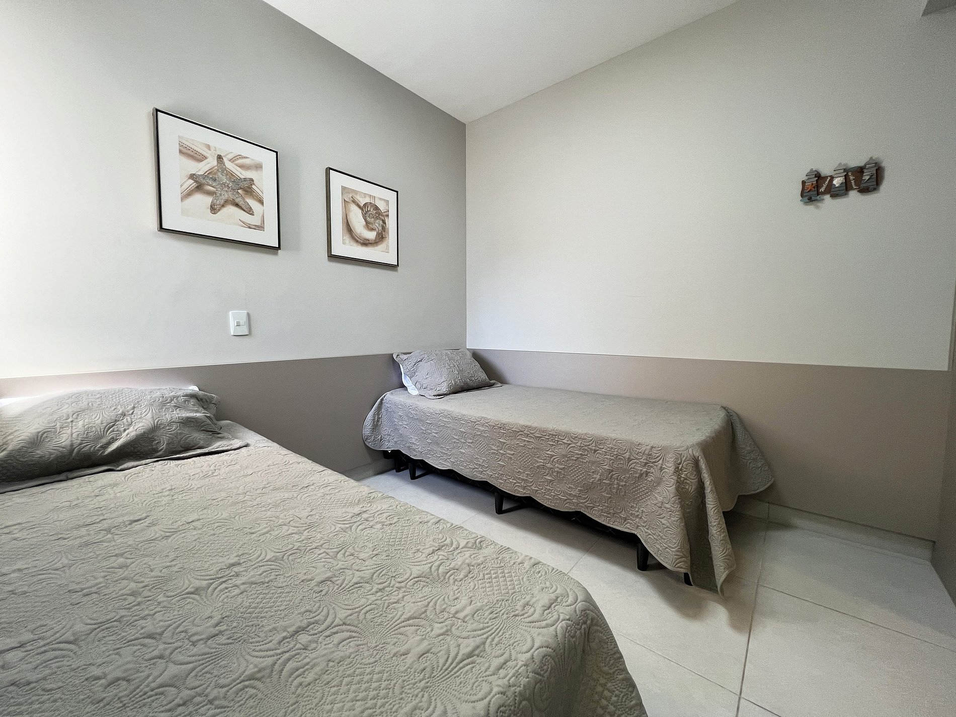 ONDE VOCE VAI DORMIR: O Apartamento bem decorado com duas suítes, sendo a primeira com uma cama de casal, e a segunda com duas camas de solteiros e um sofá-cama de casal na sala, acomodando confortavelmente 6 pessoas incluindo crianças.