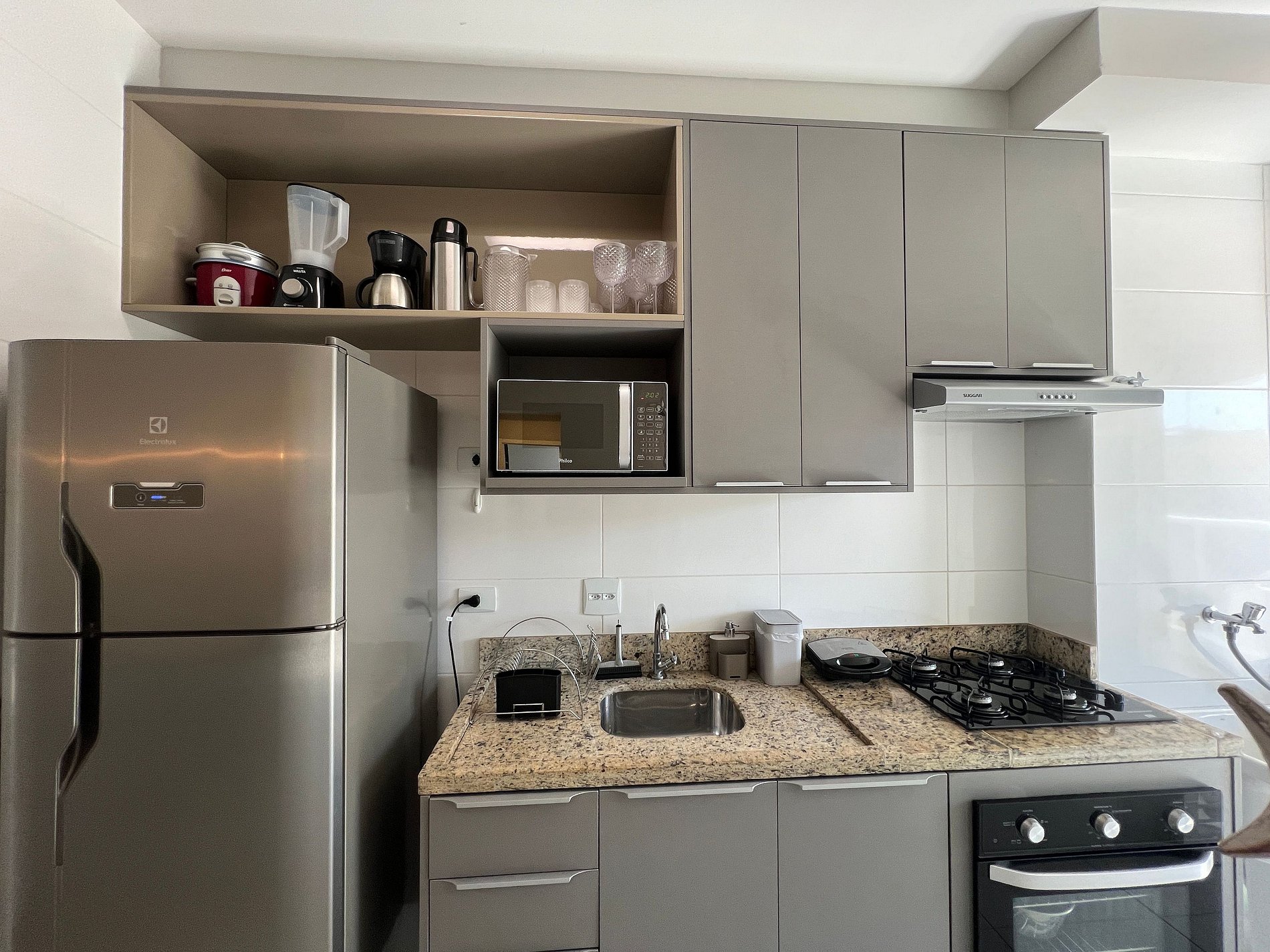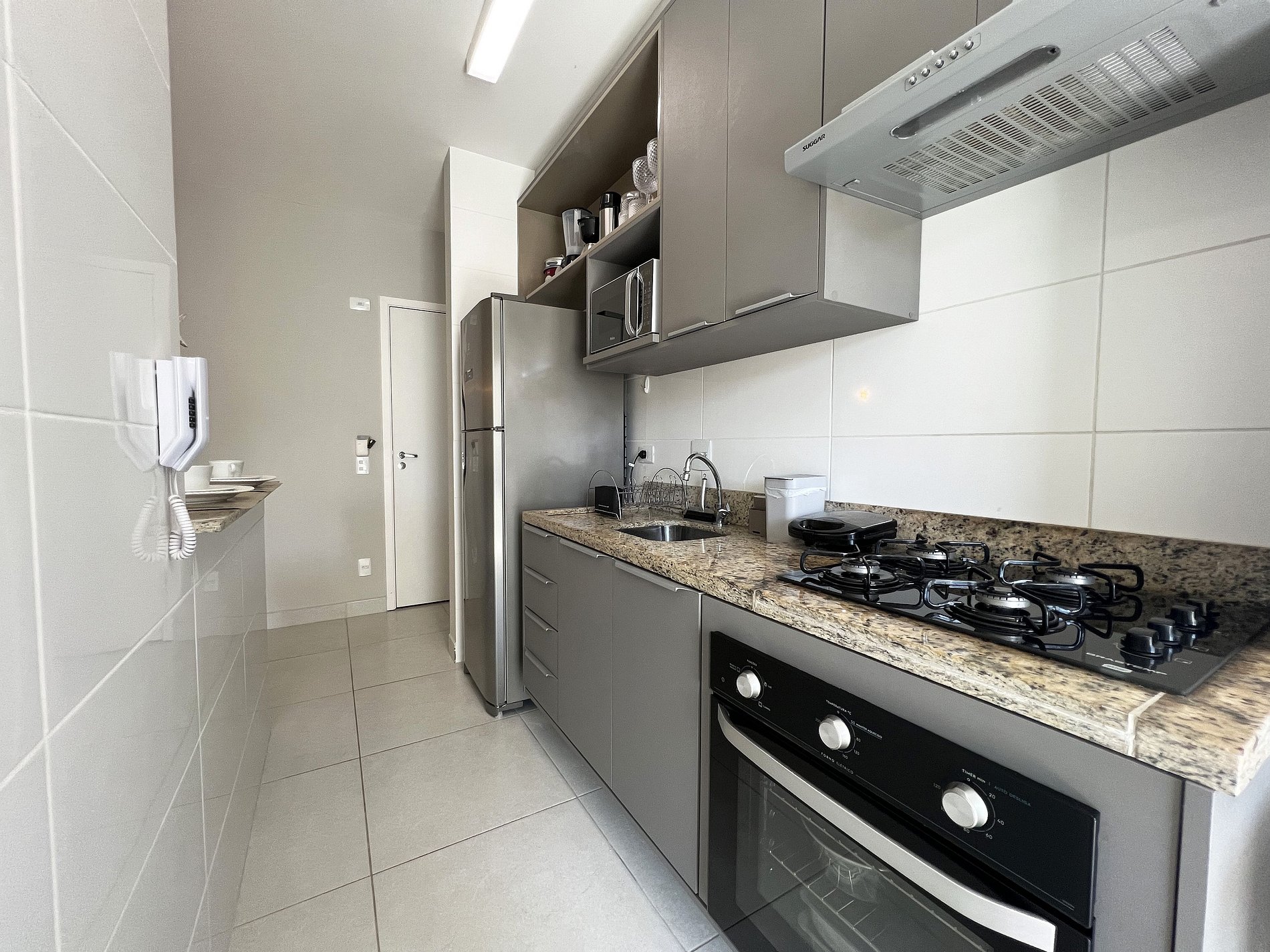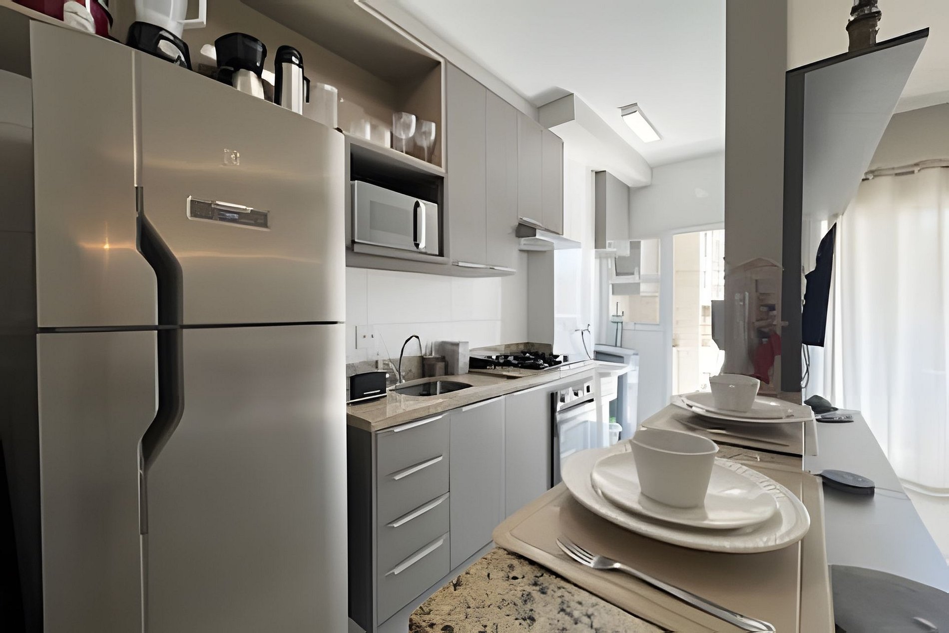 • Cozinha equipada com eletrodomésticos e utensílios básicos para preparo de refeições